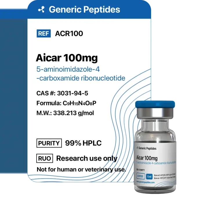 AICAR (Acadesine) 100 mg is used in research and off-label fitness contexts to enhance endurance, boost fat metabolism, and improve exercise performance. It activates AMPK, mimicking the effects of exercise, and is popular among athletes and bodybuilders for cutting cycles or endurance training optimization.