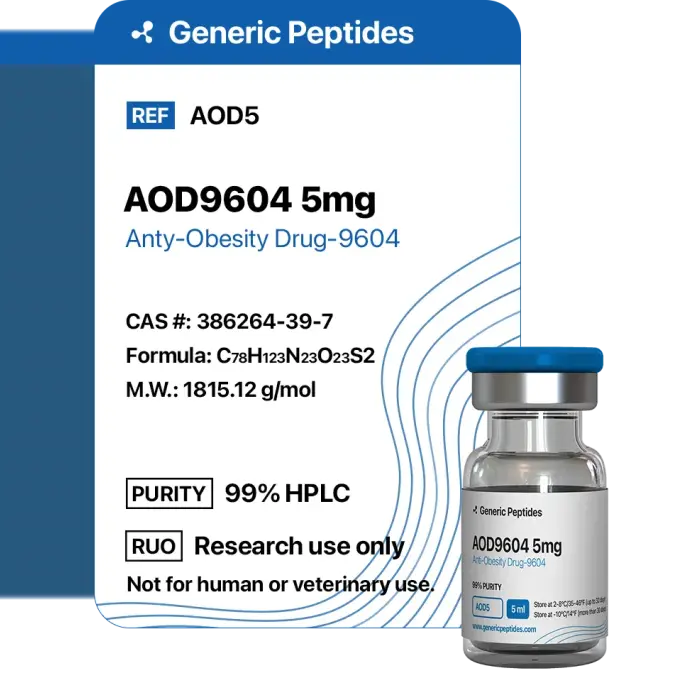 AOD 9604 5 mg is a synthetic peptide derived from the C-terminal end of human growth hormone, available in a vial from Generic Peptides. Known as AOD9604, it is used in research and off-label fitness contexts to promote fat loss and metabolic health, requiring reconstitution before use.