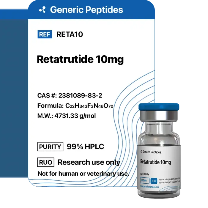 Retatrutide 10 mg is a synthetic peptide agonist for GLP-1, GIP, and glucagon receptors, available in a vial from Generic Peptides. Known as Retatrutide, it is used in research and off-label contexts for obesity and metabolic syndrome management, requiring reconstitution before use.