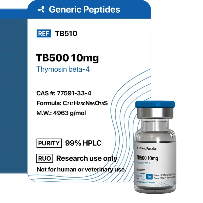 TB 500 10 mg is a synthetic version of Thymosin Beta 4, a peptide that promotes tissue repair, reduces inflammation, and aids recovery, available in a vial from Generic Peptides. It is used in research and off-label contexts to support healing from injuries or muscle strain, requiring reconstitution before use.