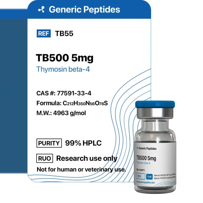 TB 500 5 mg is a synthetic version of Thymosin Beta 4, a peptide that promotes tissue repair, reduces inflammation, and aids recovery, available in a vial from Generic Peptides. It is used in research and off-label contexts to support healing from injuries or muscle strain, requiring reconstitution before use.