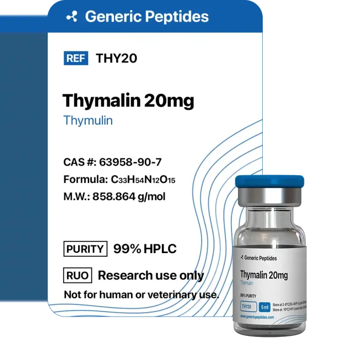 Thymalin 20 mg is a synthetic polypeptide extracted from the thymus gland, available in a vial from Generic Peptides. Known as Thymalin, it is used in research and off-label contexts to modulate the immune system, particularly for T-cell differentiation and anti-aging, requiring reconstitution before use.
