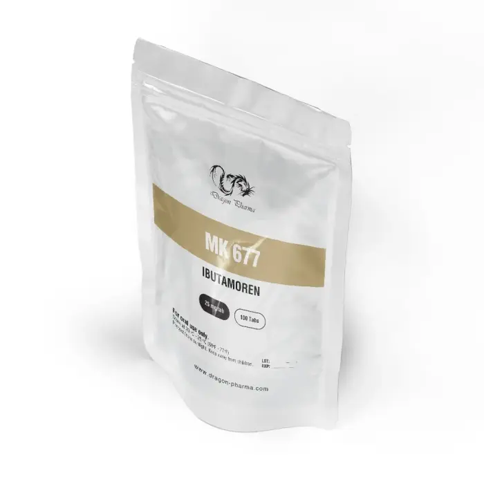 MK 677, or Ibutamoren, is a non-peptide growth hormone secretagogue classified as an oral compound in this 25 mg/tab, 100-tab pack from Dragon Pharma. Developed for muscle-wasting conditions, it's widely used in bodybuilding to increase growth hormone (GH) and IGF-1 levels for muscle growth and recovery. As an oral compound, it has minimal hepatotoxicity, no aromatization, and no significant HPTA suppression, though monitoring is advised.