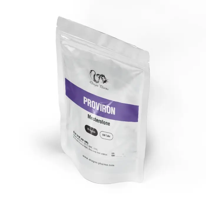 Proviron, containing Mesterolone, is an oral anabolic-androgenic steroid (AAS) at 25 mg/tab in a 100-tab pack from Dragon Pharma. Used in bodybuilding to enhance libido, muscle hardness, and androgenic support, it's valued for its mild profile and anti-estrogenic properties. As an oral DHT derivative, it has minimal hepatotoxicity, no aromatization, and low HPTA suppression.