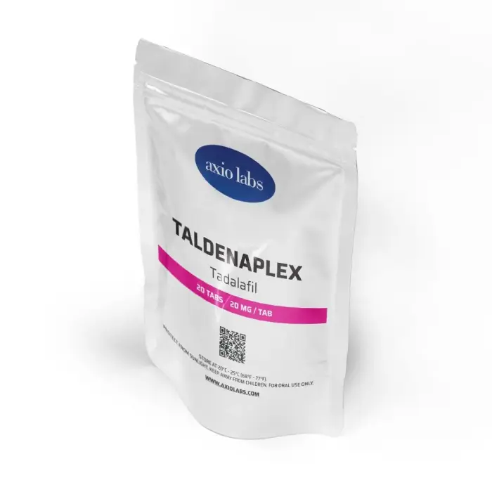 Taldenaplex, containing Tadalafil Citrate, is an oral PDE5 inhibitor at 20 mg/tab in a 20-tab pack from Axiolabs. Known as Cialis, it's used medically to treat erectile dysfunction and benign prostatic hyperplasia (BPH), and off-label by bodybuilders to counter ED caused by steroid-induced testosterone suppression. It has minimal hepatotoxicity, no anabolic effects, and is effective for extended sexual performance enhancement.